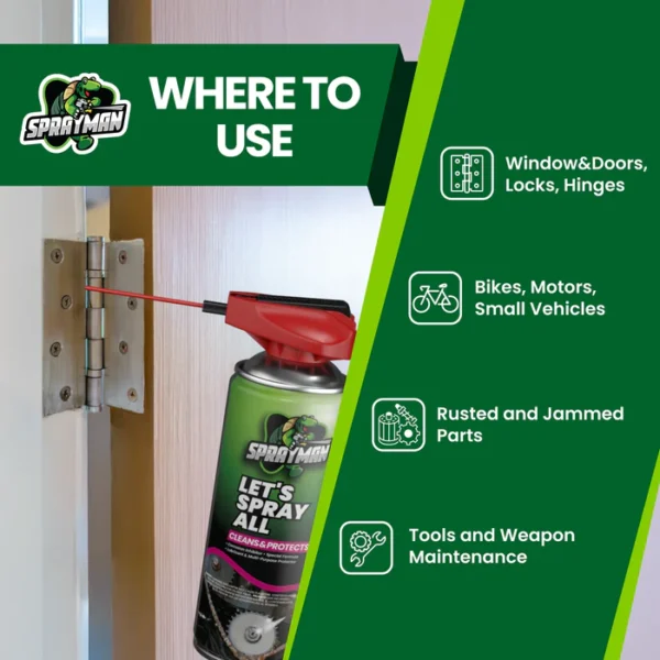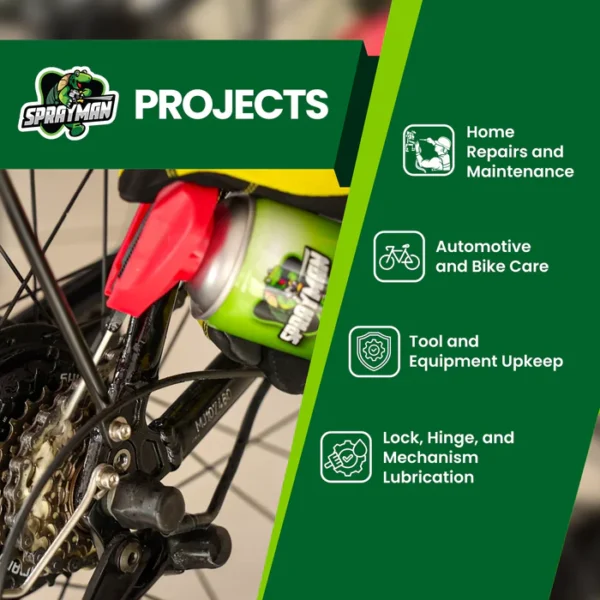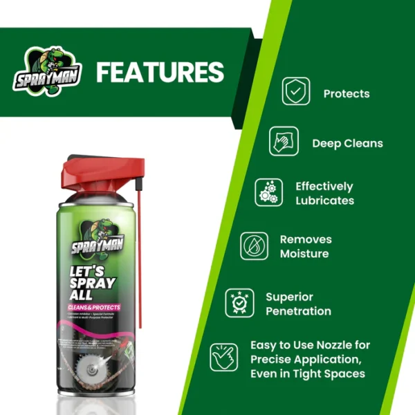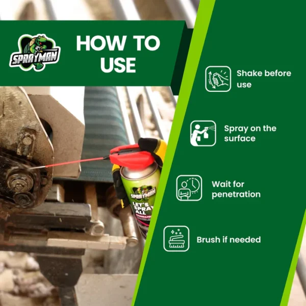 Sprayman Let’s Spray All is a versatile, multi-purpose lubricant spray, a reliable WD 40 alternative that cleans, lubricates, and protects in a single application. Engineered to loosen rusted parts, protect against corrosion, and drive out moisture, this aerosol spray is ideal for industrial applications, home repairs, and daily maintenance. Free from silicone and dirt-trapping additives, its formula creates a lasting protective film that prevents rust and corrosion, ensuring peak performance for various tools and machinery.