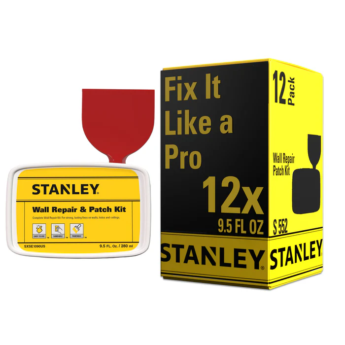 The Stanley S552 Wall Repair Patch Kit is your comprehensive solution for drywall repair. This all-in-one kit is perfect for fixing drywall cracks, splits, wall holes, and other surface imperfections on both walls and ceilings. It includes a ready-mixed dry wall repair kit compound, a flexible self-adhesive perforated aluminum patch, sandpaper, and an ergonomic plastic putty knife.